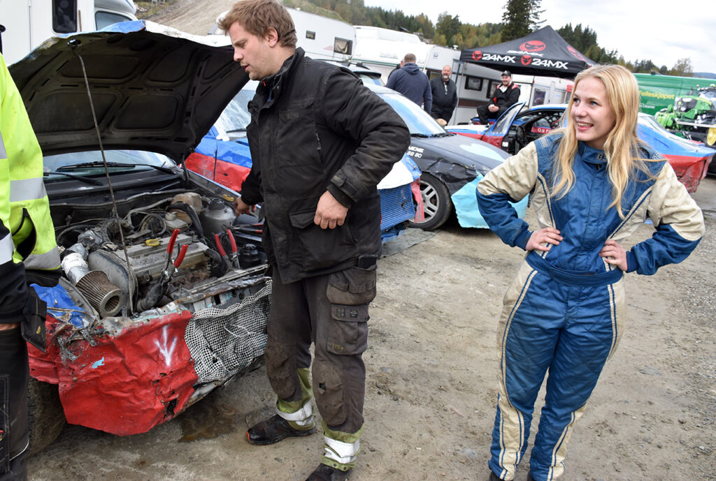 STOLT PAPPA: I gang med å bytte radiator før A-finalen til Thea. – Jeg ble godt tatt i mot i dameklassen og det var en super gjeng å kjøre sammen med. Gleder meg allerede til neste sesong!, sier Thea til Bilcross.no etter dame-debuten. Thea planlegger å kjøre både åpen- og dameklasse framover. Foto: Stian Ormestad, Bilcross.no.