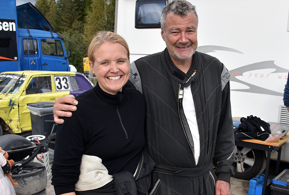 JUBELSCENER: Marthe Ryen og Terje Hoff (begge NMK Gardermoen) har delt bil gjennom hele cupen og begge tok topp-plasseringer og vant pengepremier i sammendraget. Terje klarte noe ingen andre har klart før ham: Vinne alle tre cup-løpene. Foto: Stian Ormestad, Bilcross.no.