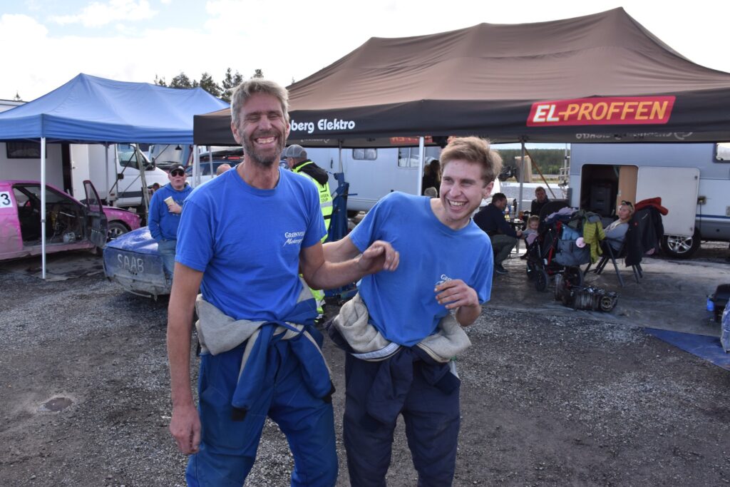 KONKURRANSEINSTINKT: Vennskapelig far-sønn-kjekling i depot under Sølvcrossen 2025 – der både far og sønn er klare for A-finale. Foto: Stian Ormestad, Bilcross.no.