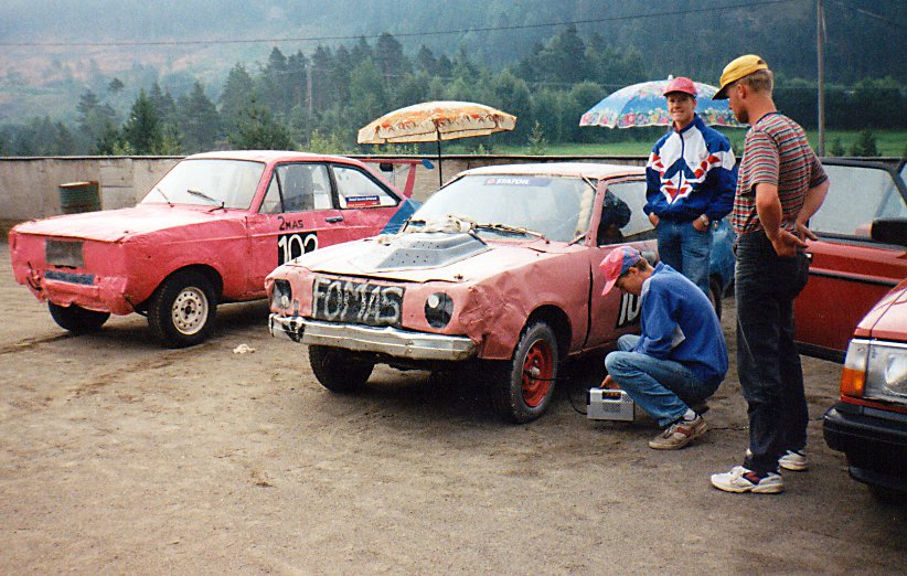 BILCROSS-DEPOT FOR SNART 30 ÅR SIDEN: Kompisene Stensvand og Hauge klare for kamper på bilcrossbanen med Ford Escort MKII og Mazda 323. Tredjemann i A-finalen var Kjetil Flåten, som du hører i podcasten Førermøte. Foto: Privat.