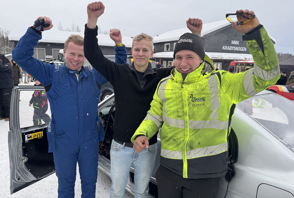 VINNERLAGET – IGJEN: Kristian Lien (NMK Hamar, Lukas Tovsrud og Henrik Hofton (begge NMK Modum Sigdal) vant årets sesongstart med 3-timersløp, akkurat som de vant fjorårets sesongavslutning med 3-timersløp. Foto: Stian Ormestad, Bilcross.no.