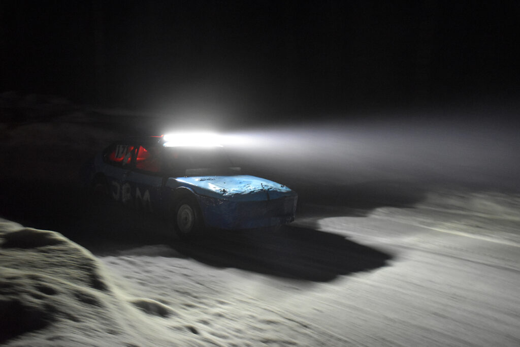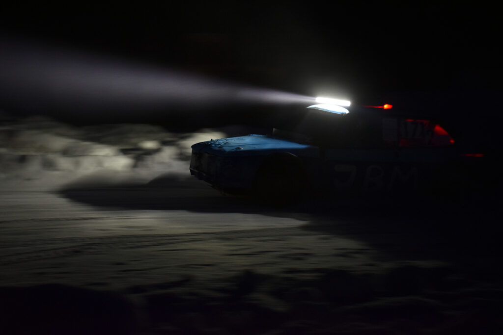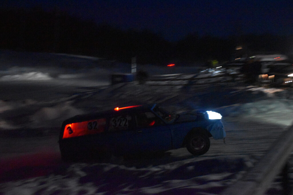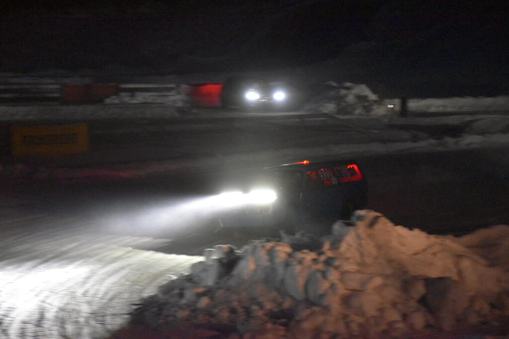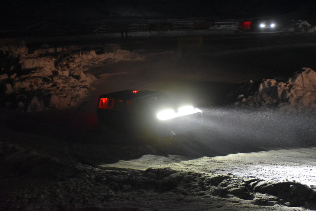 GODT BELYST: Det synes godt når bilene kommer – lys er fritt, minimum er kjørelys fremover, parklys bakover, pluss en blinkende markør på taket fra arrangøren for å finne bilen igjen i mørket hvis noe skulle skje. Foto: Stian Ormestad, Bilcross.no.