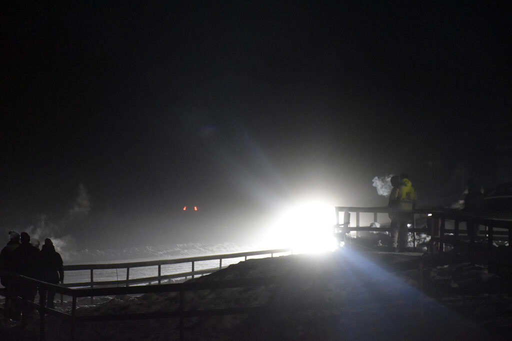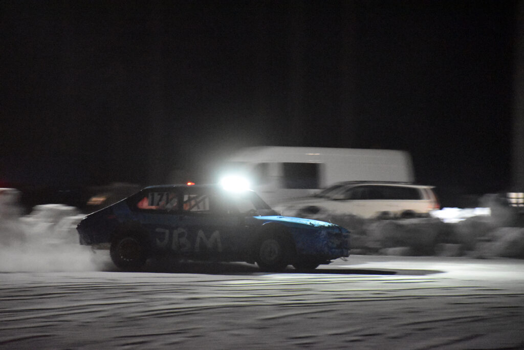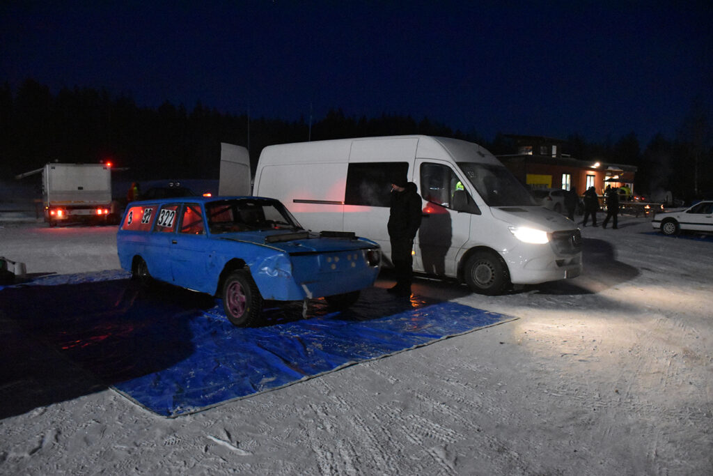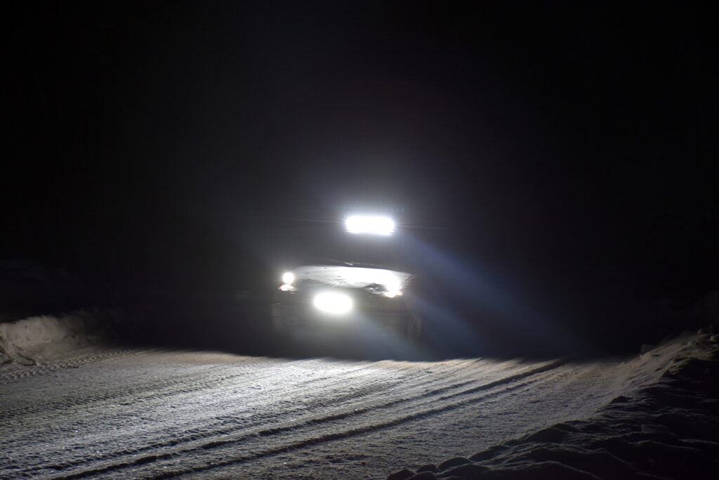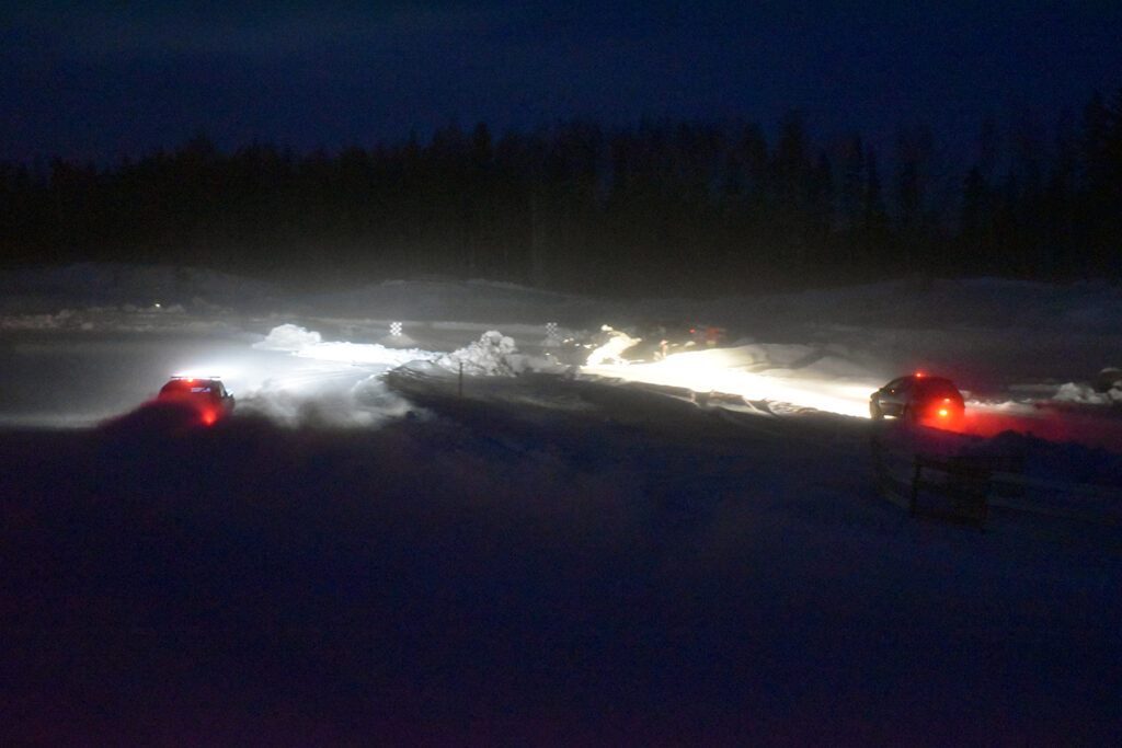 GODT BELYST: Det synes godt når bilene kommer – lys er fritt, minimum er kjørelys fremover, parklys bakover, pluss en blinkende markør på taket fra arrangøren for å finne bilen igjen i mørket hvis noe skulle skje. Foto: Stian Ormestad, Bilcross.no.