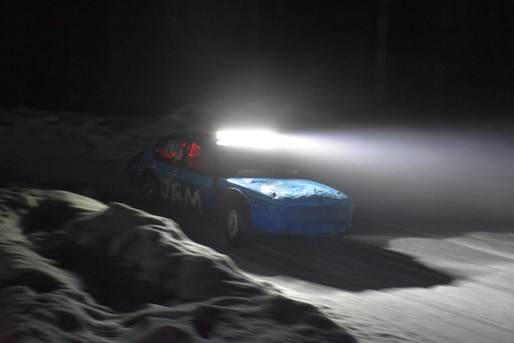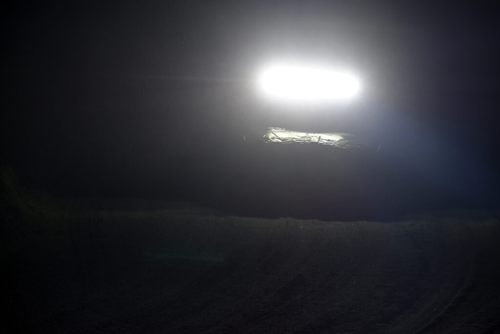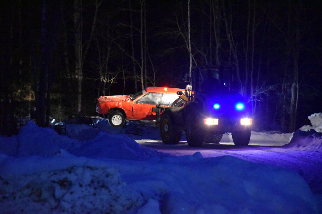 KONTURER: Av et bulkete panser i lyset fra sterke lyskastere. Foto: Stian Ormestad, Bilcross.no.