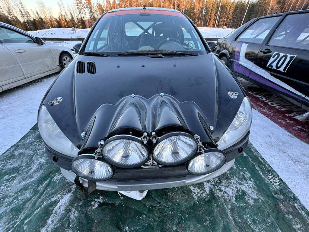ORIGINALLYKTER: Denne Peugeoten hadde fortsatt de originale lysene intakt, samt at det ble montert lyktepodder underveis. Foto: Stian Ormestad, Bilcross.no.