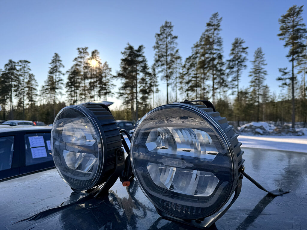LYSENDE FREMTID: Denne Saaben har fått en ledstripe på panseret, supplert med to nesten like kraftige grøftelys. Lysutrustning er fritt og personlig, når det kjøres løp i mørket i Sverige. Foto: Stian Ormestad, Bilcross.no.