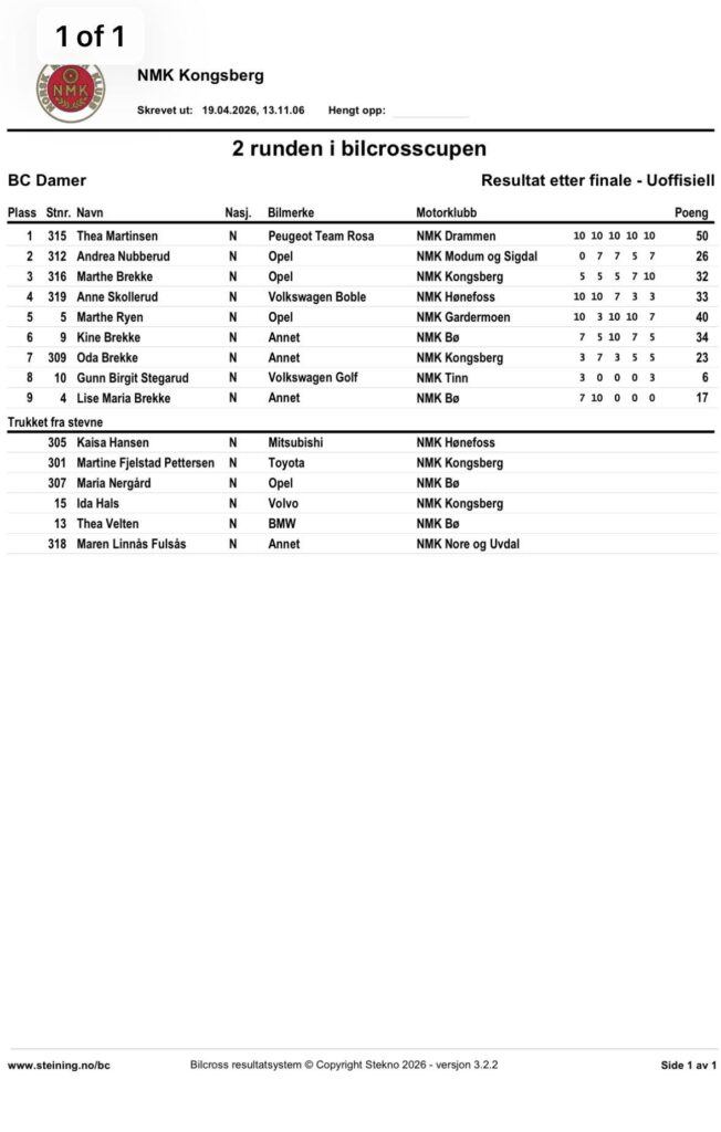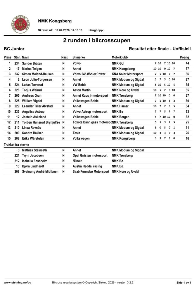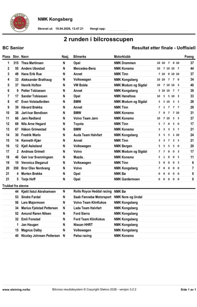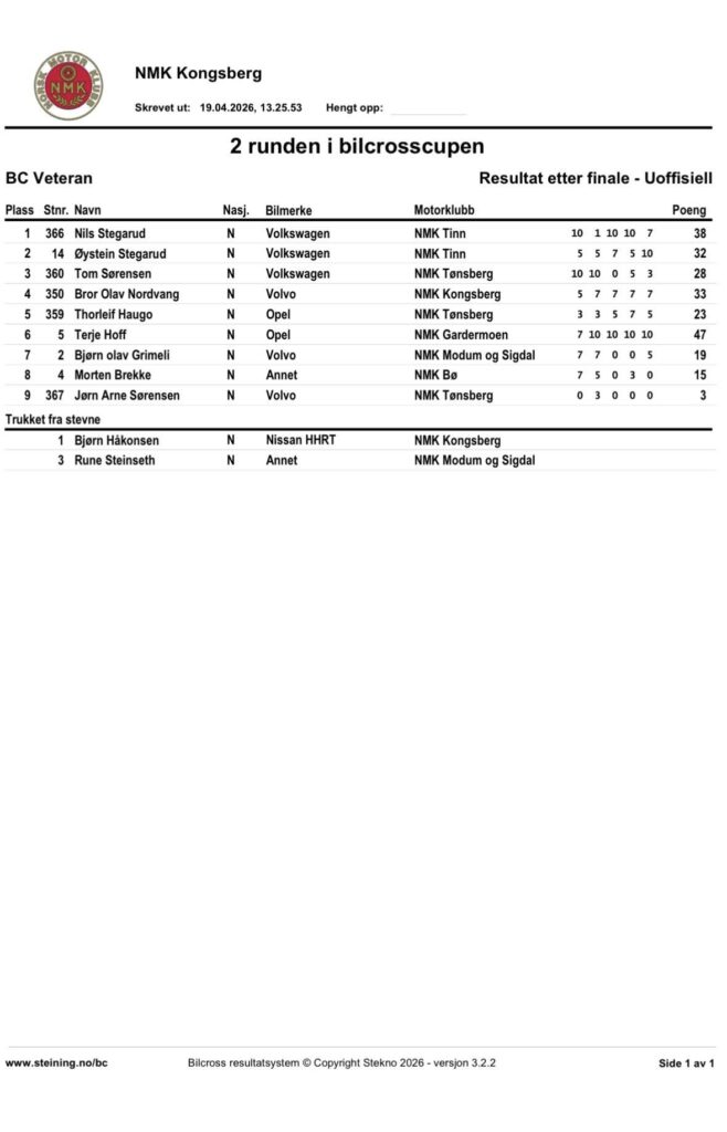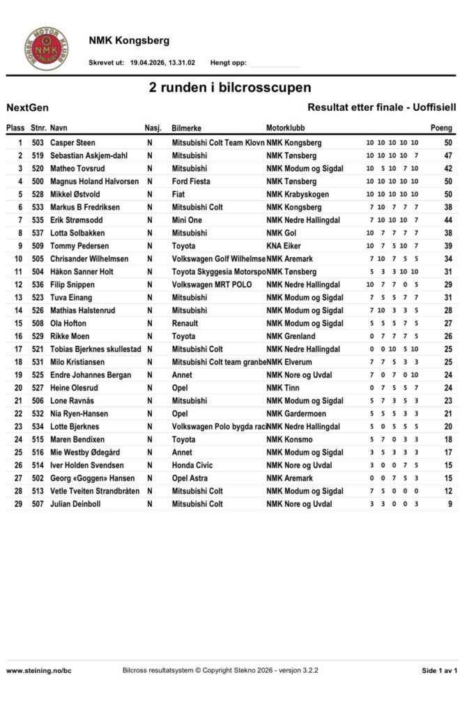 Alle Bilcross-resultatene fra Vårløp på Kongsberg 2026 – 2. runde i Bilcross.no-cup 2026: