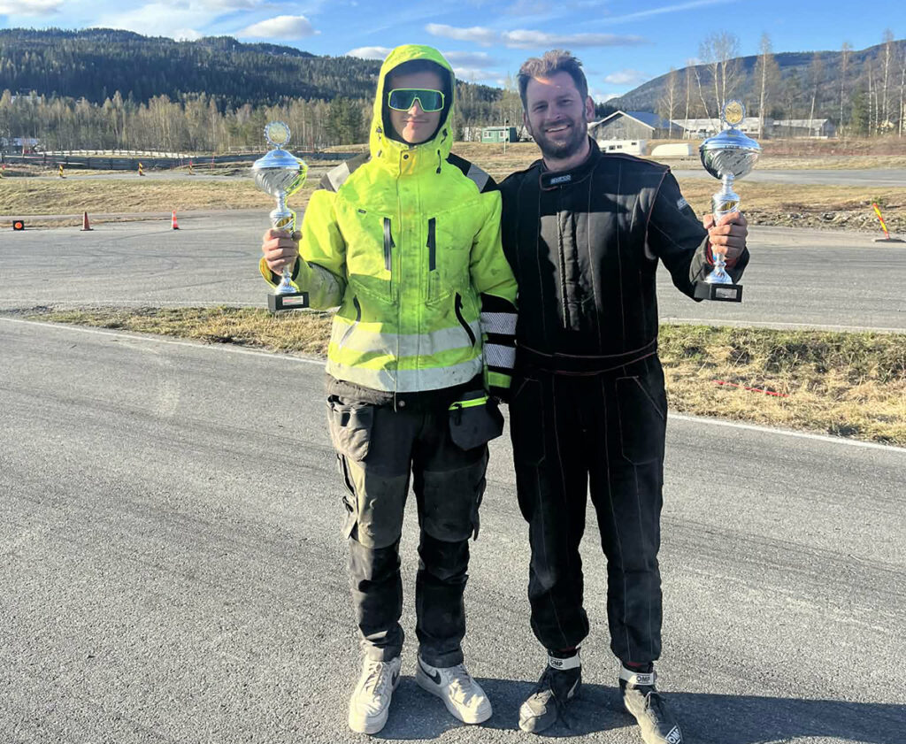 DOBBELTSEIER: Sander Bråten og pappa Jan-Erik Bråten (begge NMK Gol) med hver sin førstepremie-pokal etter Vårløp på Vinjarmoen 2026. Sander vant nok en junior-seier, og Jan-Erik tok sin aller første bilcross-seier i åpen klasse. Foto: Privat.