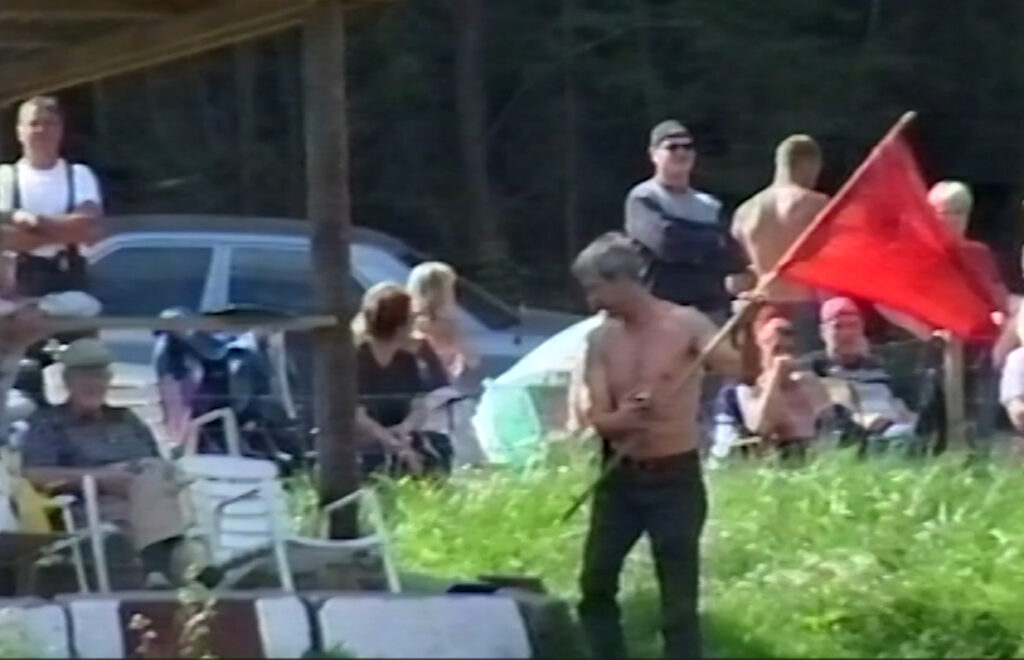 RØVERHEAT: Det ble sjelden brukt flagg, nå strammes det inn. Her står Nils Torfinn Ralle med rødflagget, etter å ha stoppet et røverheat på Rallebanen som gikk over alle støvelskaft. Foto: Stian Ormestad, Bilcross.no.