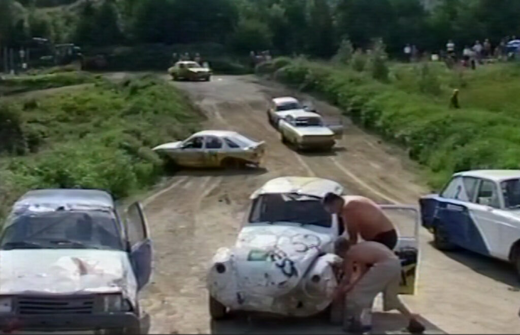 RØVERHEAT: Bilde fra filmen, etter et massekrasj i røverheat på Rallebanen. Foto: Stian Ormestad, Bilcross.no.